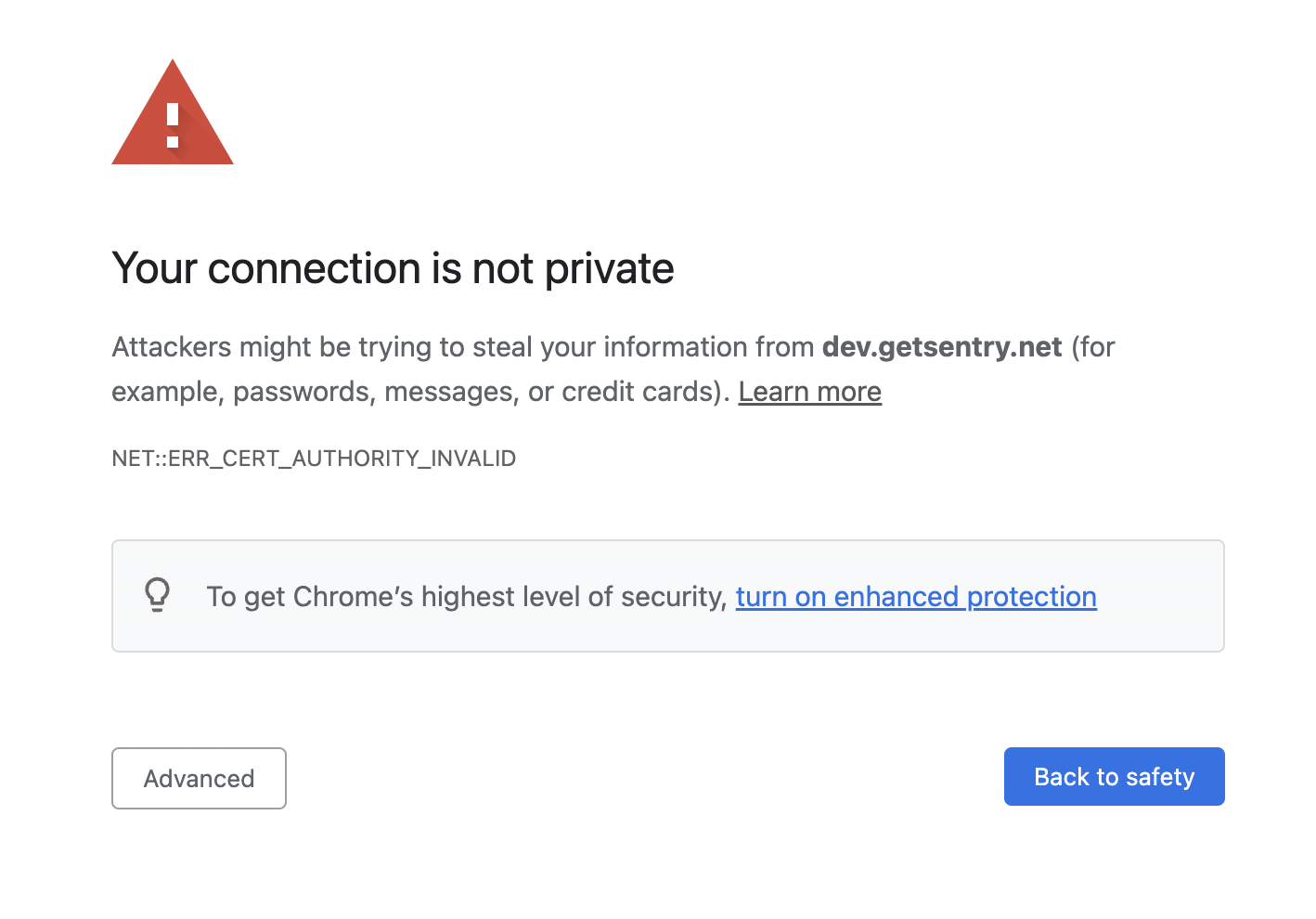 NOTE: Webpack outputs the IP from where the SPA is being served (e.g. https://192.168.0.200:7999/). Do not use it or you will still get the message above. The generated local certificates are only for localhost, 127.0.0.1 and dev.getsentry.net: Any of these values would work.